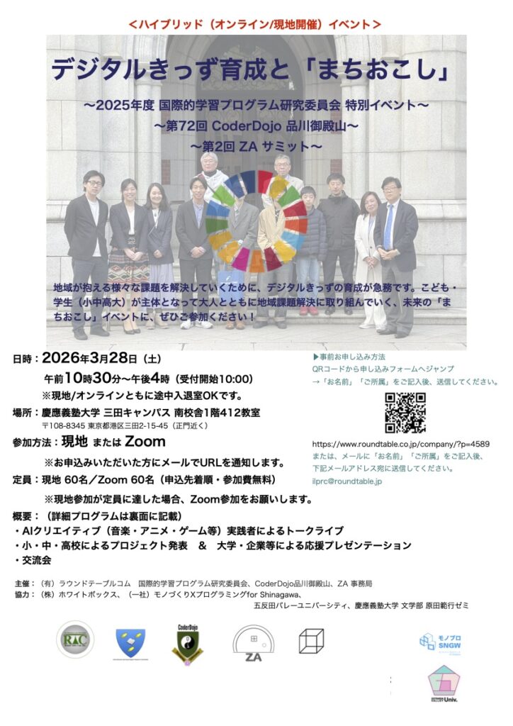 主催:(有)ラウンドテーブルコム 国際的学習プログラム研究委員会、CoderDojo品川御殿山、ZA 事務局